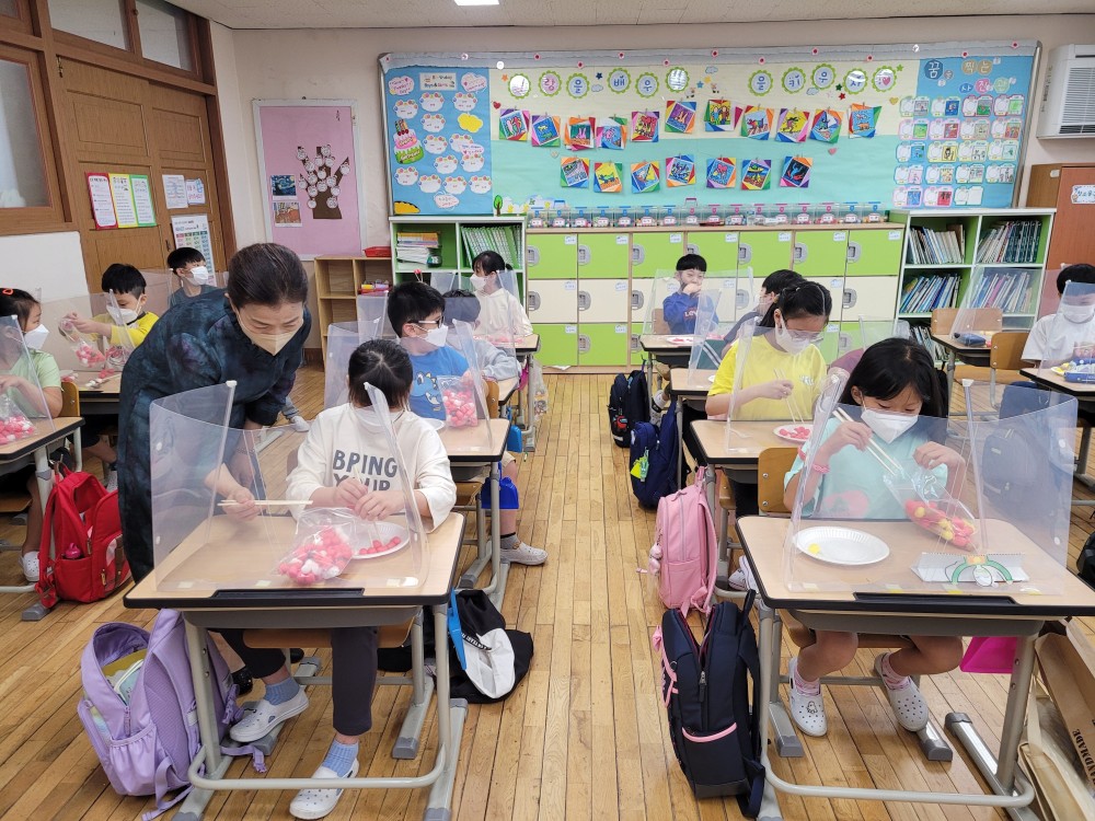 2021년 9월 29일 효성동초등학교에서 활동한 밥상머리예절 (젓가락잡기와 식사예절) 교육 사진입니다.