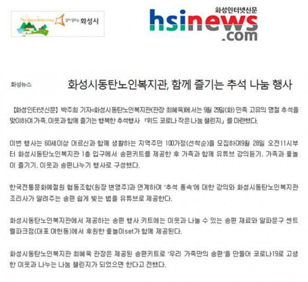 2020년 9월 29일 추석. 화성시 동탄노인복지관과 함께 한 [위드코로나 작은나눔챌린지 - 추석 풍속] 활동입니다