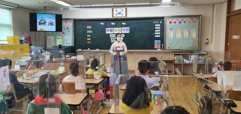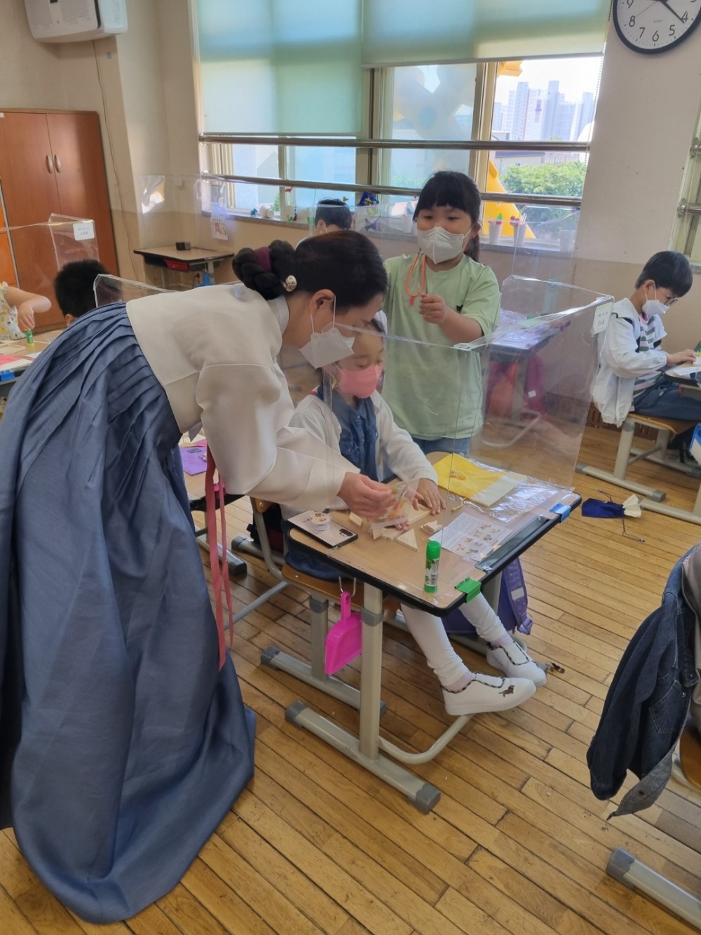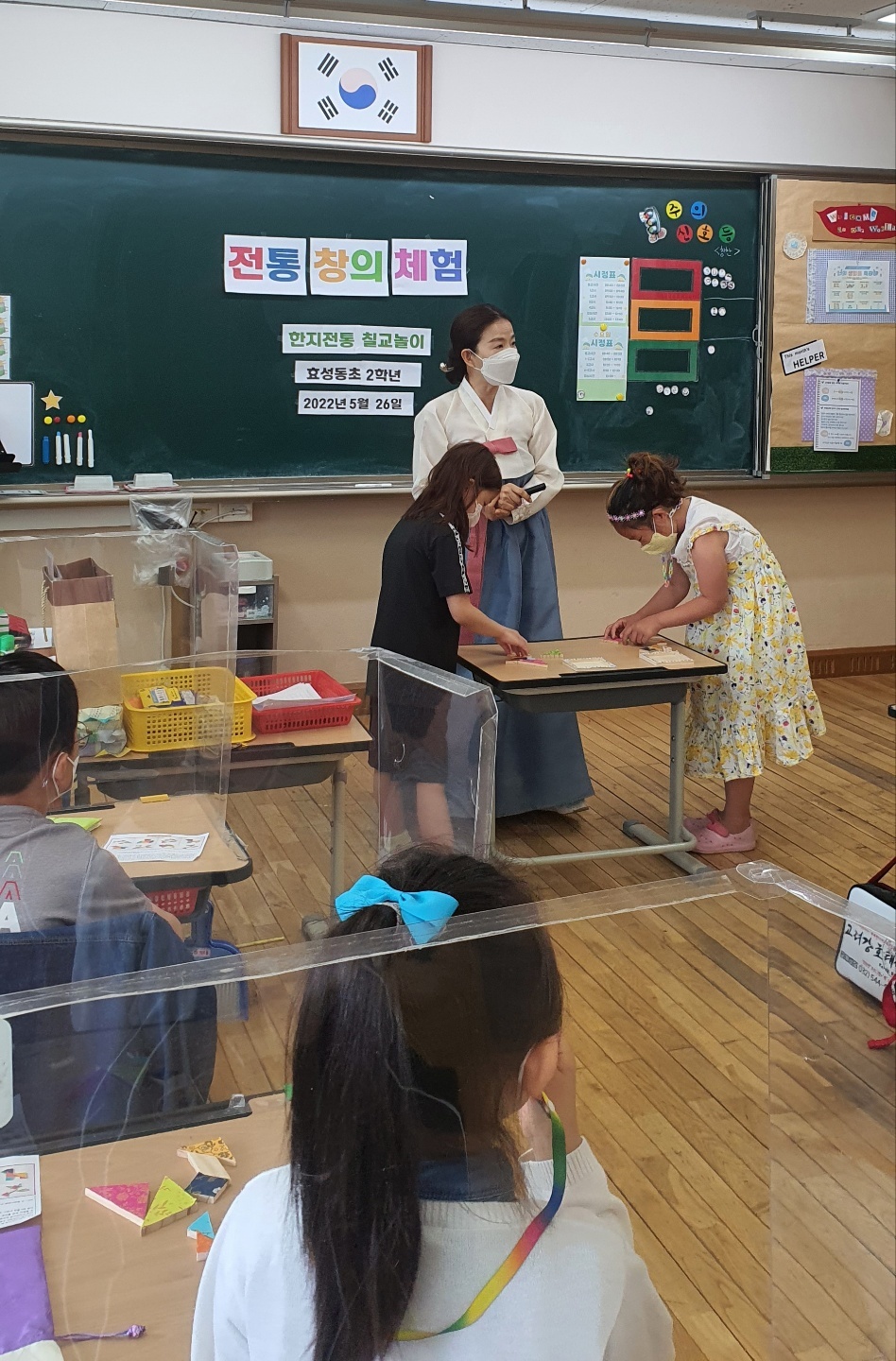 2022년 5월 26일 효성동초등학교 2학년을 대상으로 교육한 한지전통 칠교놀이 수업 사진입니다.